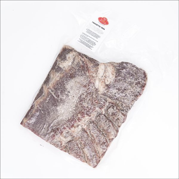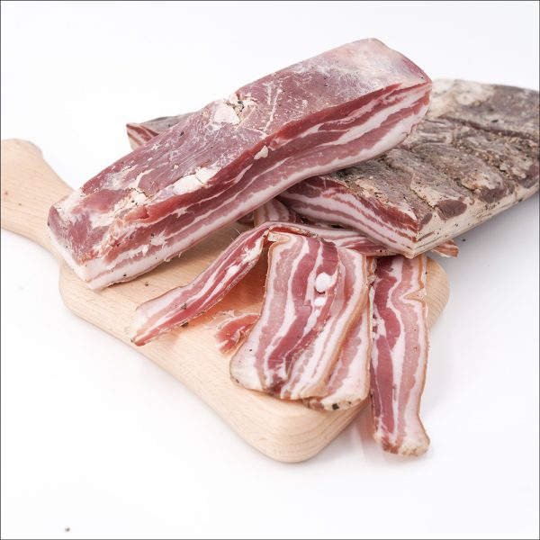 Si ricava del ventre del maiale. Grazie al confezionamento, che porta la parte grassa all’esterno, risulta morbida e dal gusto saporito, ma non troppo pronunciato. La parte magra è minoritaria, permettendone così un agevole utilizzo in preparazioni culinarie. Viene impiegata per la confezione di ripieni o per avvolgere carni magre – come la selvaggina – prima della cottura. La stagionatura è relativamente breve, perché la pancetta si mantenga morbida: una prolungata attesa rischia infatti di farla divenire, oltre che troppo dura, eccessivamente salata.